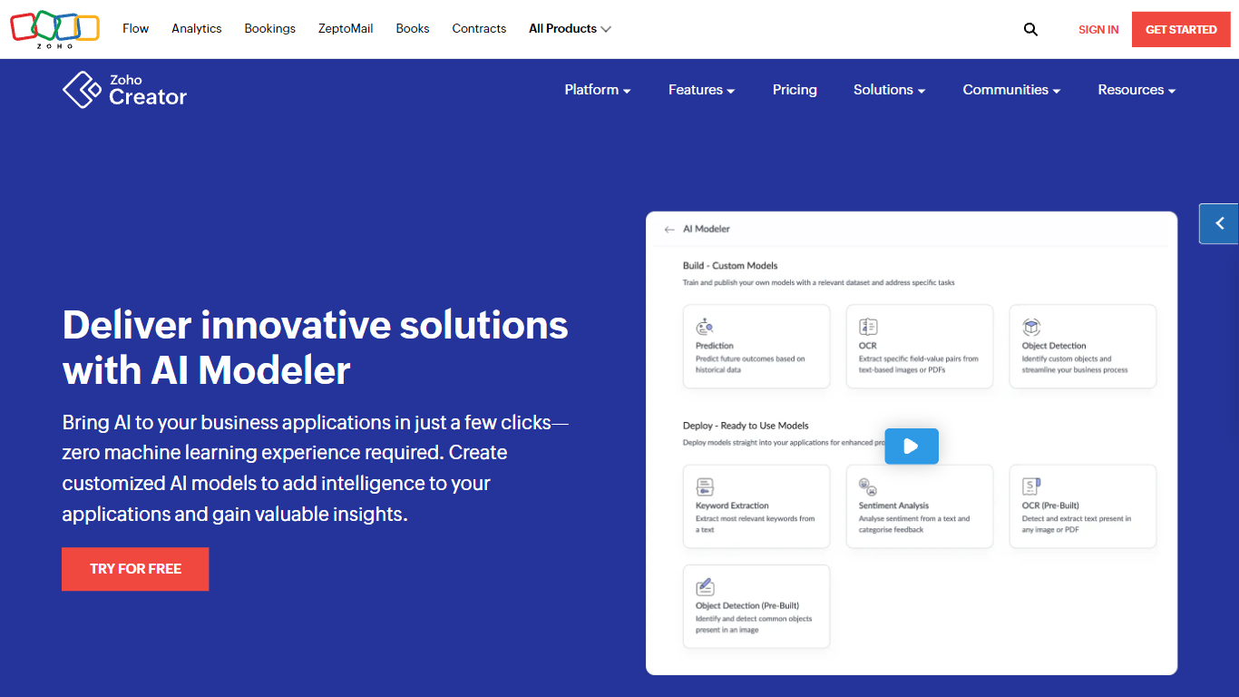 The platform is user-friendly and offers world-class AI features that can be utilized with just a few clicks. Whether you aim to predict future outcomes, detect objects, extract text, or analyze customer sentiment, AI Modeler provides a seamless way to incorporate AI into your applications. Additionally, Zoho Creator offers support to help you construct an AI strategy that aligns with your business needs.