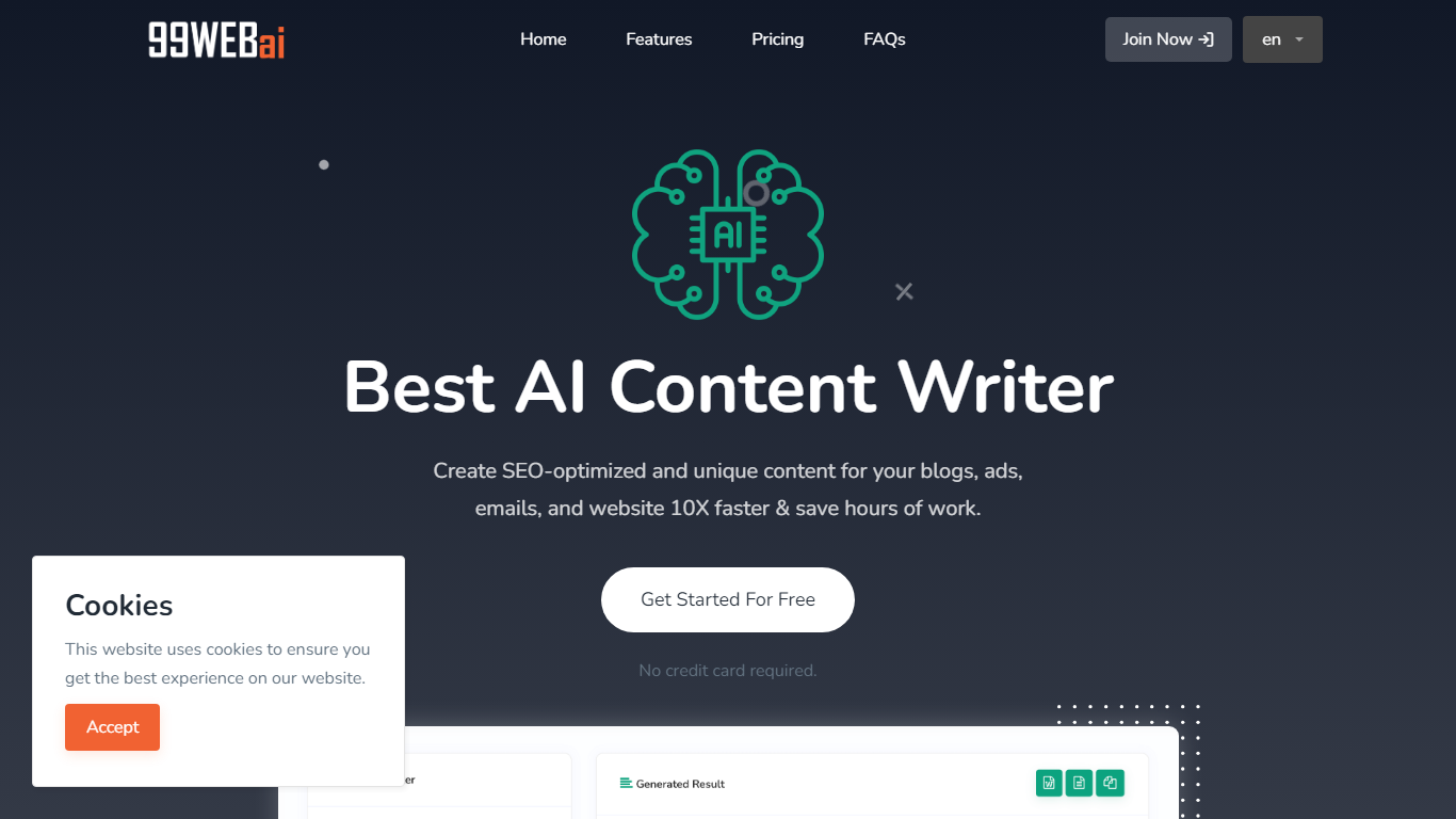 Discover the power of AI writing with 99WEB AI, your go-to solution for generating SEO-optimized content effortlessly. Our platform leverages ChatGPT technology to create engaging blog posts, compelling sales copy, effective marketing emails, and more. With 99WEB AI, you’ll save countless hours while producing high-quality, unique content that resonates with your audience.