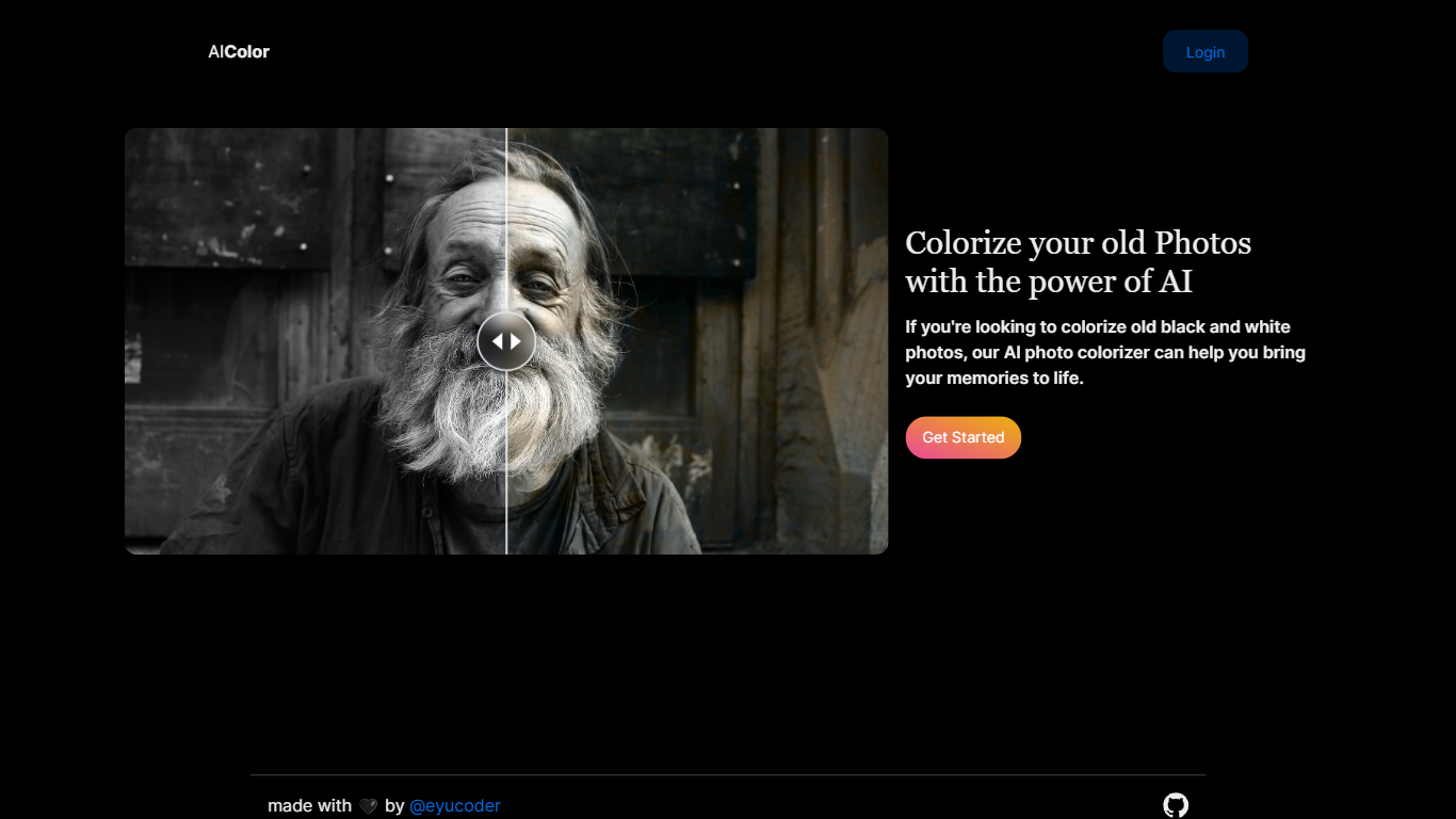 Revitalize your cherished memories with our advanced AI Color tool, designed to breathe life into your old black and white photos. Utilizing cutting-edge artificial intelligence, AI Color allows you to effortlessly transform monochromatic images into vibrant, colorized photographs. Our user-friendly interface ensures a seamless process from start to finish, making it accessible for anyone to colorize their vintage photos. Experience the magic of seeing your historical images in color, revealing details and bringing a new dimension to your visual legacy. Simply login and let our AI-powered photo colorizer guide you through an easy-to-use journey of rediscovery. Made with dedication and 🖤 by @eyucoder, our tool is your gateway to preserving your past in beautiful color.