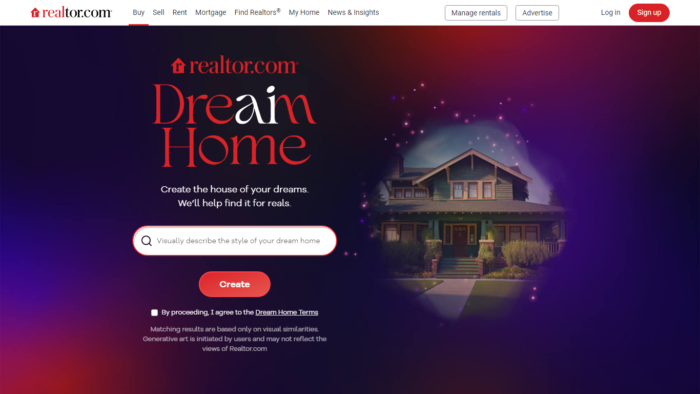 Discover your ideal home with AI Dream Home on Realtor.com, where your imagination paves the way to reality. Dive into a user-friendly experience that prioritizes visual aesthetic, empowering you to find a home that resonates with your unique style preferences. Keep in mind, our innovative service focuses on visual matches, which means while the homes might embody your dream design, they may vary in location and price. By embracing generative art powered by user input, Realtor.com reinforces that the visuals displayed do not necessarily represent its viewpoints. Start your journey by agreeing to Dream Home Terms, and let us bridge the gap between your dreams and a home you’ll love.