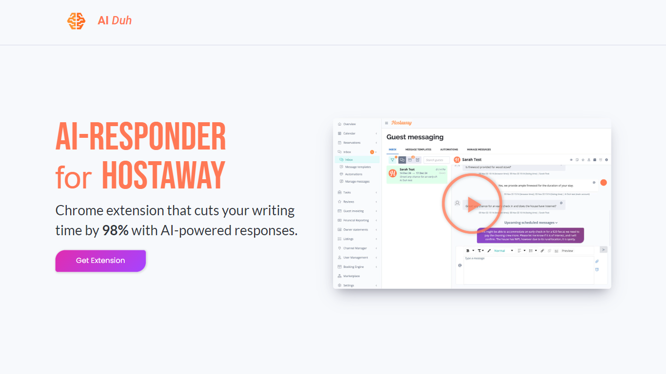 AI-responder for HostAway is a powerful Chrome extension that significantly reduces your writing time with the help of AI-powered responses. It utilizes artificial intelligence to provide quick and accurate responses, cutting your writing time by up to 98%. With AI-responder, you can effortlessly handle customer inquiries, provide detailed information, and address concerns with ease. The extension draws information from property-specific knowledge documents, guest data, and previous chat history to ensure a smooth and personalized conversation. The AI responses generated by AI-responder are of exceptional quality, often indistinguishable from human-written responses. The pricing for the Chrome extension is estimated to be around $95 per month per listing after the beta period, but during the beta phase, users can enjoy a 14-day free trial and a lifetime price lock of $49 per month per listing (up to 300 queries per month per listing). AI-responder is currently compatible with HostAway, and plans are underway to extend its availability to other platforms, mobile devices, and different browsers. For any further queries or information, you can reach out to us at contact@aiduh.com.