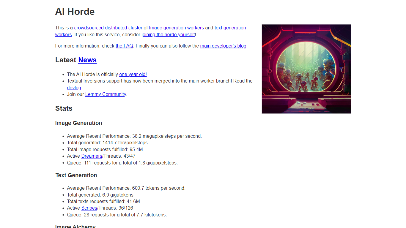 - **High Performance:** With an average recent performance of 31.1 megapixelsteps per second in image generation and 416.5 tokens per second in text generation the horde delivers impressive results.
