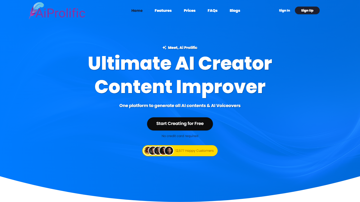 Welcome to Ai Prolific, the Ultimate AI Creator for all your content needs. Offering a one-stop solution for AI-powered content generation, Ai Prolific provides seamless creation of high-quality, human-like materials across various formats. Get started without any hassle, as no credit card is required, and join our community of over 12,577 happy customers.