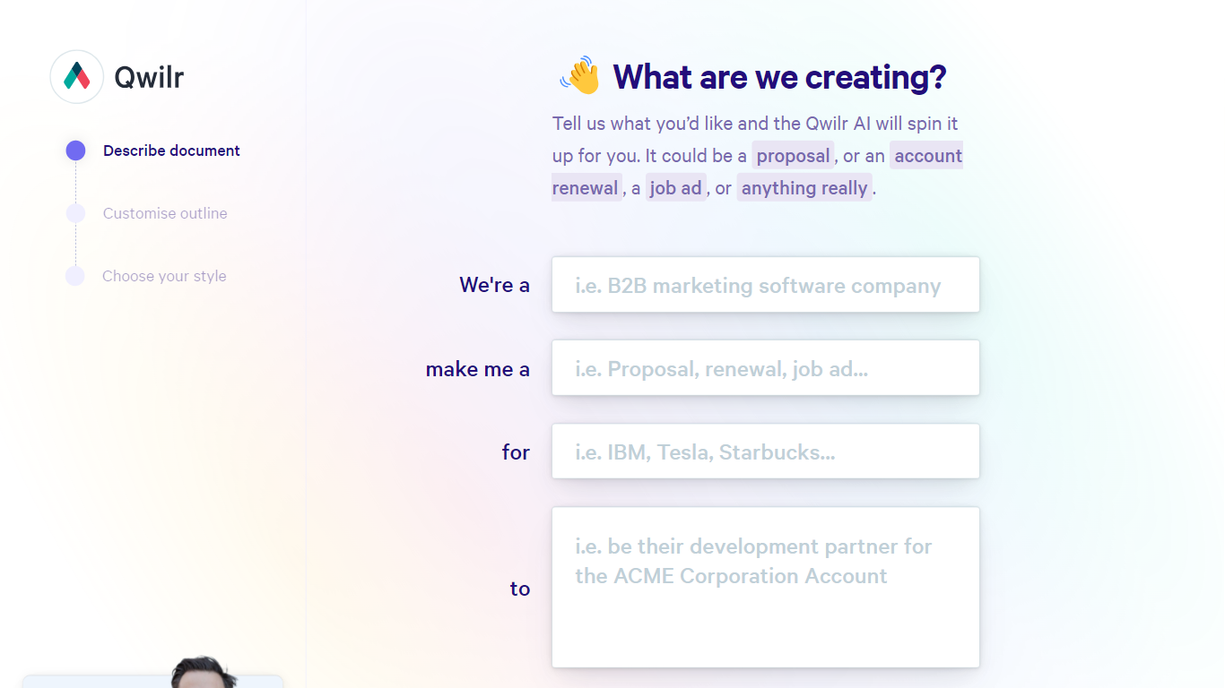 Struggling with a blank page when creating proposals or sales assets? Qwilr’s new AI Proposal Builder is here to help. Say goodbye to writer’s block and hello to efficiency, all thanks to our generative AI tech. Let your creativity flow with Qwilr’s AI Proposal Builder today.
