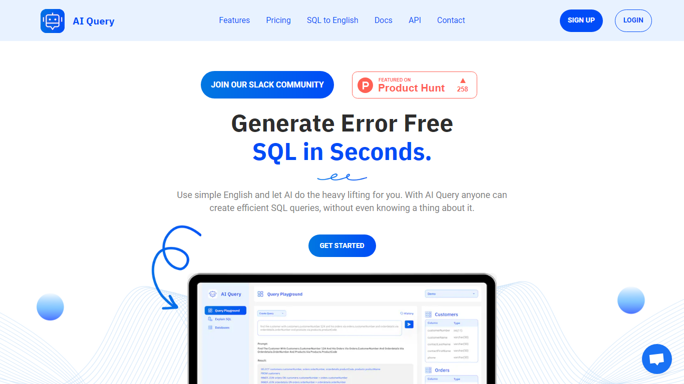 AI Query revolutionizes the way you interact with databases by transforming simple English into complex SQL queries within seconds. Leveraging the power of OpenAI GPT and Google PaLM 2 AI models, it ensures accuracy and efficiency for both novices and seasoned developers. Experience error-free SQL generation and comprehend intricate queries with our easy-to-use SQL to English Translator. The intuitive interface allows for quick schema definition, and our straightforward pricing model caters to all types of users with unlimited features and priority support.