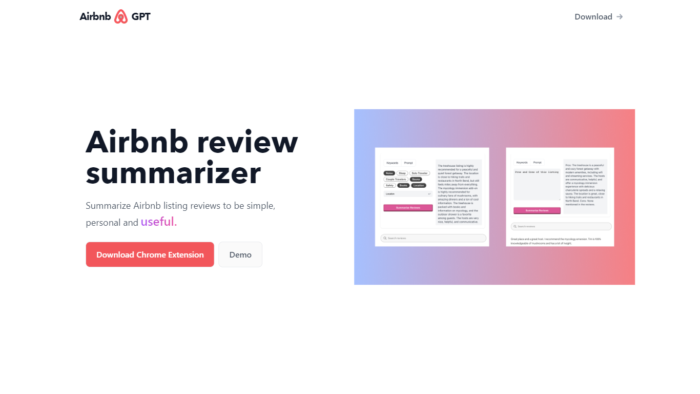 Airbnb Review Summarizer is an innovative browser extension designed to enhance the experience of Airbnb users by providing quick and insightful summaries of listing reviews. It neatly compacts the feedback from past guests into concise, personalized points that are both meaningful and easy to digest. Created by Allen, this tool focuses on simplicity and utility, ensuring that users can rapidly ascertain the quality and suitability of a listing without sifting through a multitude of lengthy reviews. The summarizer is easy to install and is compatible with Chrome, making it a convenient addition to your travel planning tools.