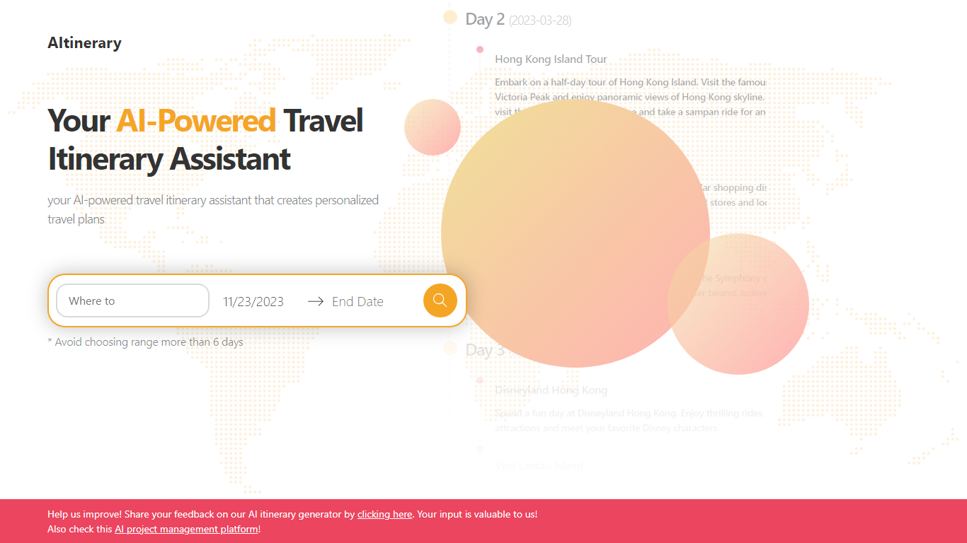 Embark on a journey to discover the vibrant city of Hong Kong with AItinerary, your AI-powered travel itinerary assistant. AItinerary simplifies your travel planning by creating a personalized and detailed itinerary for your visit. Experience the city’s dynamic blend of tradition and modernity, from the iconic skyline of Victoria Peak to the historic Aberdeen Fishing Village.