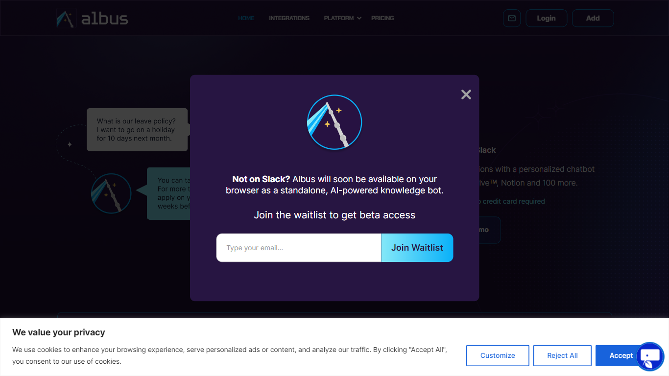Enjoy a **14-day trial** with the ability to ask up to **50 questions**, offering a risk-free opportunity to explore Albus’s capabilities. No credit card is required to get started. Easily add Albus to your Slack workspace or use the web version to start reaping its benefits.