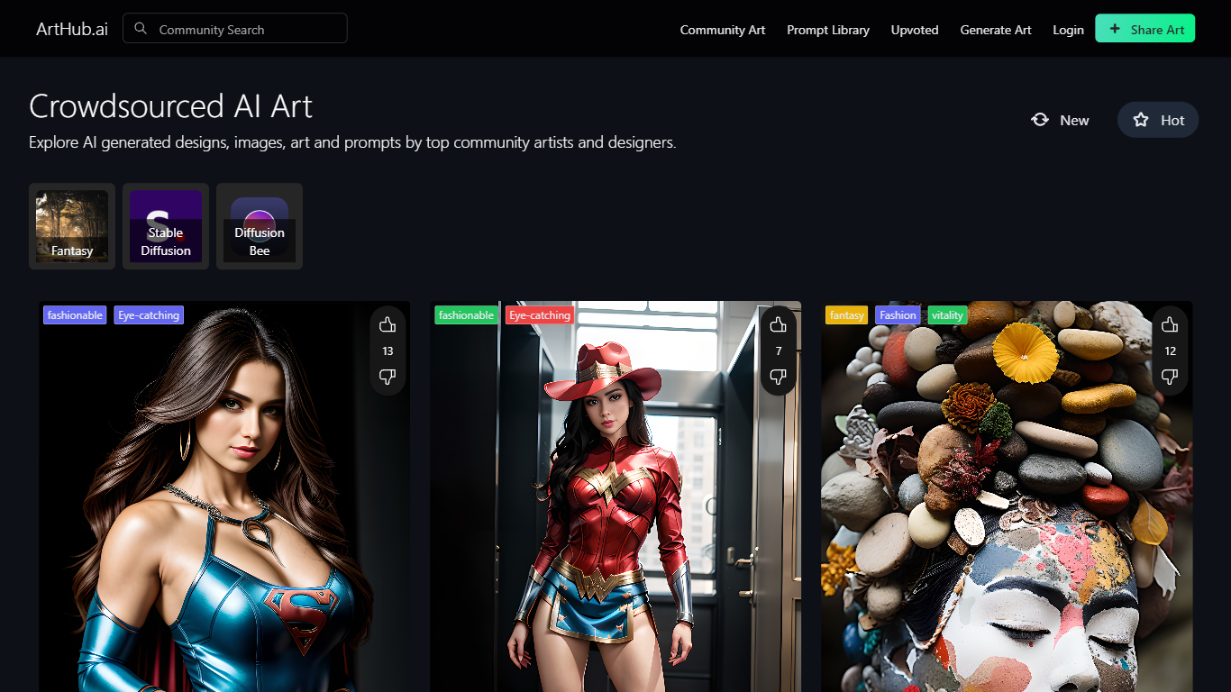 - **Explore AI-generated art:** ArtHub.ai allows users to explore a diverse range of AI-generated designs images and art created by talented community artists and designers.