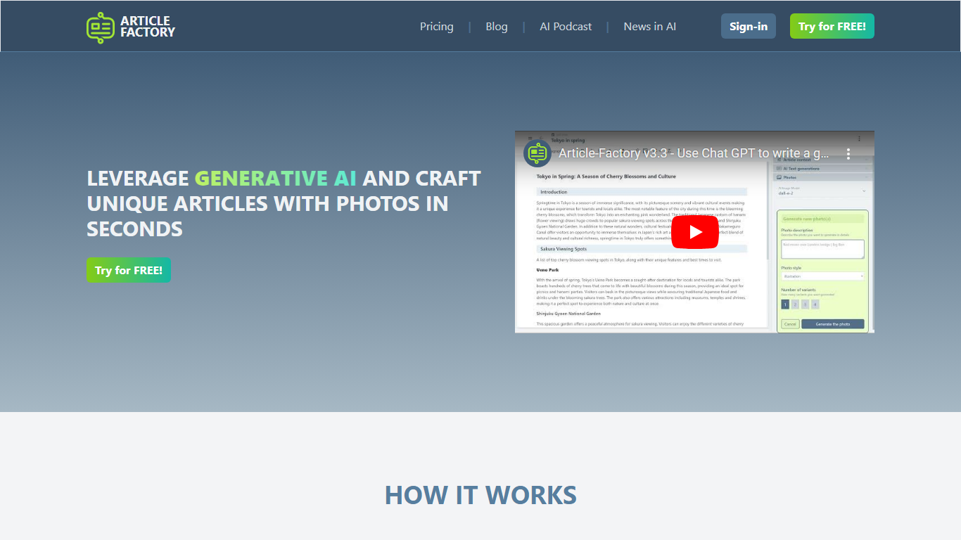 Unlock your content creation potential with Article Factory, an innovative web application designed to empower professionals and students alike. Article Factory harnesses the power of Generative AI to produce unique and high-quality articles, blogs, news pieces, and more, within seconds. No credit card is required to dive into its user-friendly interface; simply sign up and enjoy a generous free tier with the option to create engaging and original content effortlessly.