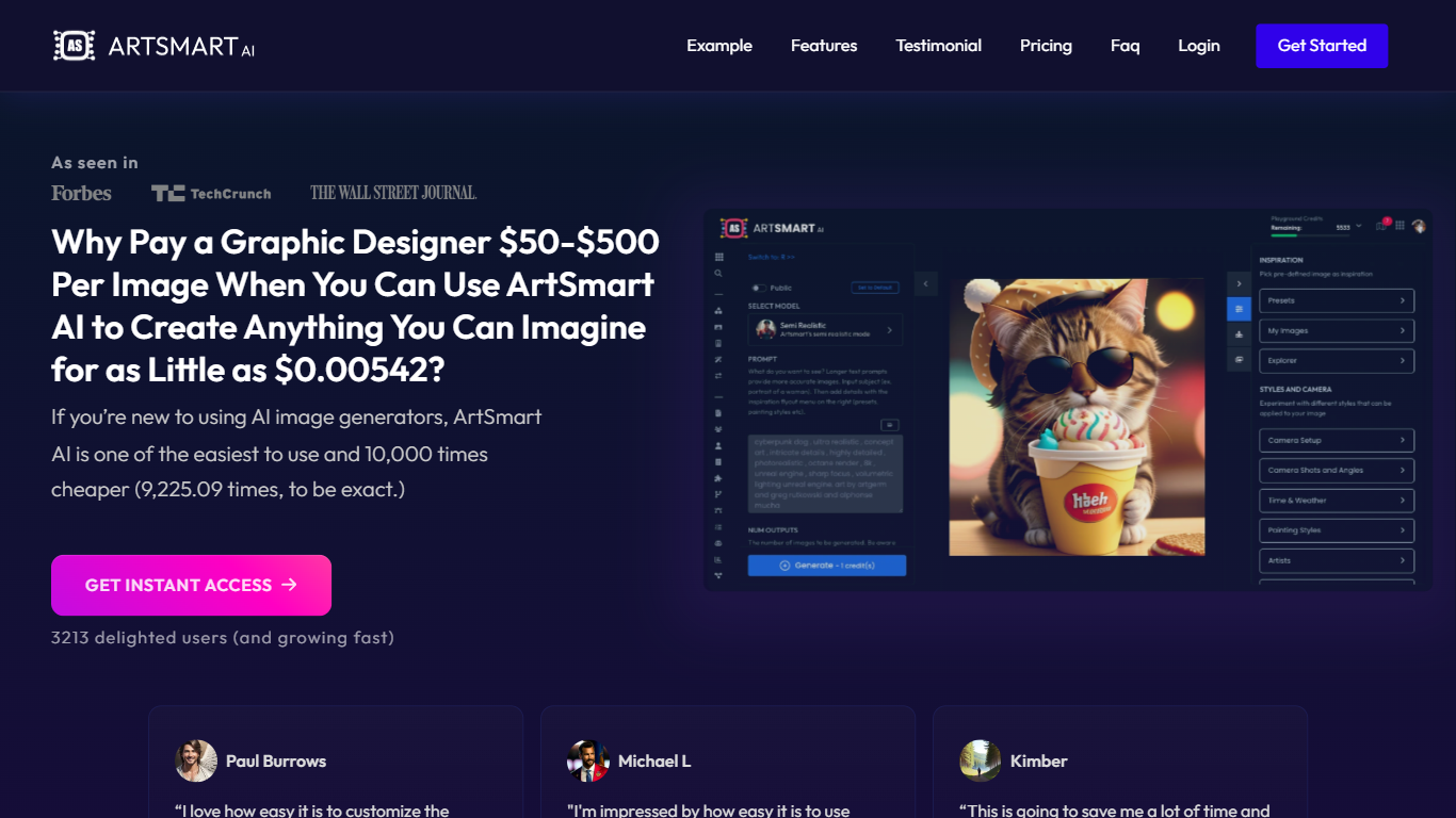 Join the ArtSmart AI community of 3,213 artists, prompt designers, and marketers and get instant access to the powerful AI image generation tool. With a 30-day money-back guarantee, you can try ArtSmart AI risk-free.