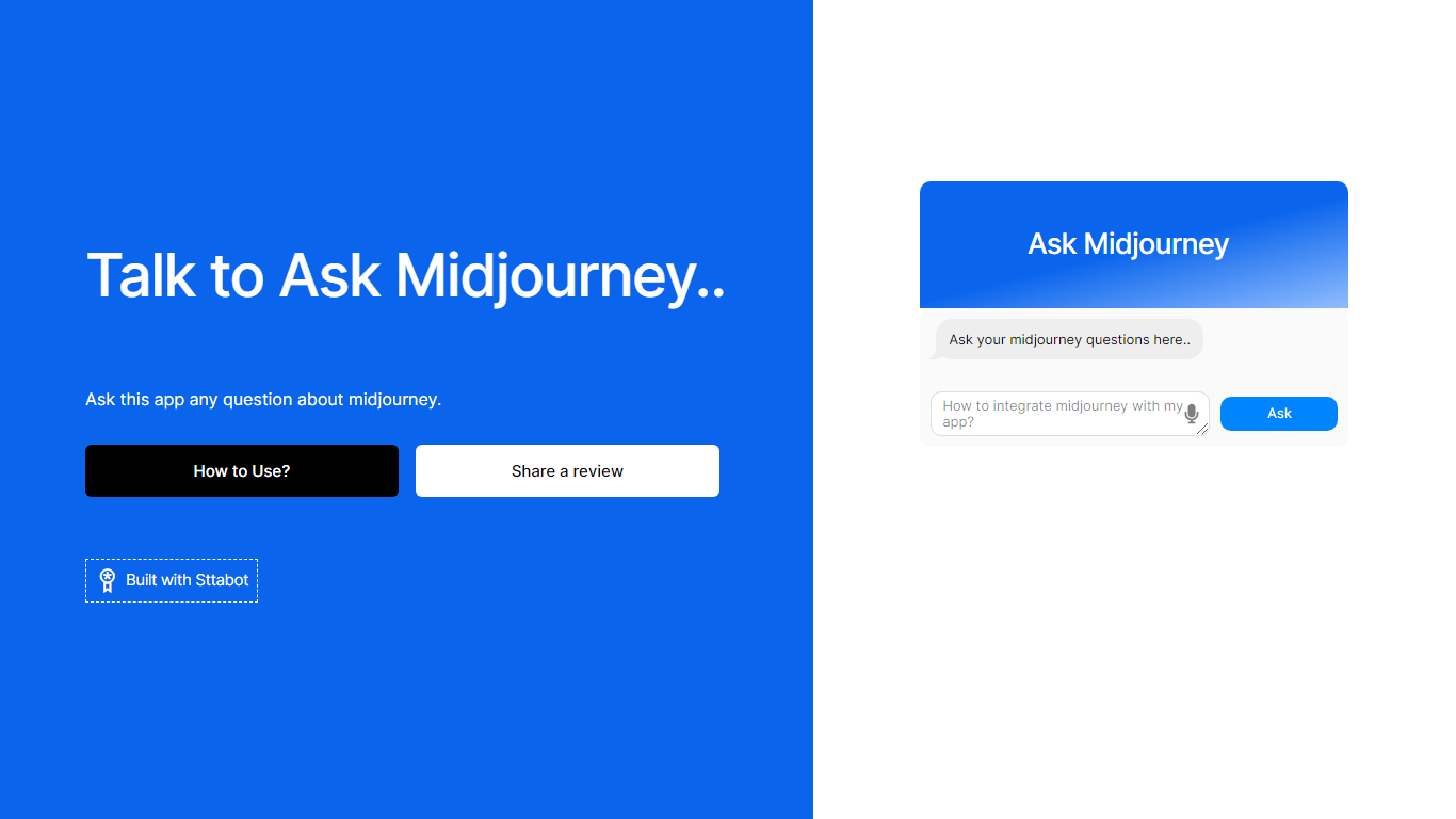 Welcome to Ask Midjourney – Sttabot Dashboard, an intuitive platform designed to assist you with inquiries related to your midjourney. Whether you’re looking for guidance or have specific questions, our app makes it easy to get the answers you need. With a clean and user-friendly interface, learning how to navigate and utilize our dashboard is a breeze. If you’ve had a positive experience with our application, we encourage you to share your review and help others understand the value we provide. The Sttabot Dashboard is proudly built with Sttabot, ensuring a reliable and efficient service. Engage with Ask Midjourney today and take the next step in your journey with confidence.