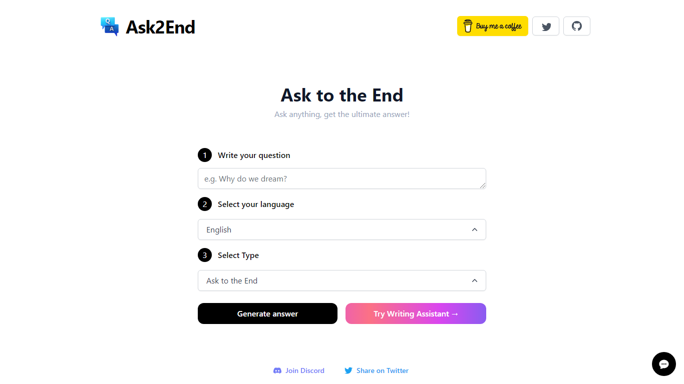 Experience the pinnacle of convenience with Ask2End, a revolutionary platform that leverages artificial intelligence to deliver precise answers to all your inquiries. With a sleek, user-friendly interface, asking questions has never been easier. Simply type in your query, choose your preferred language—currently supporting English—and let the AI work its magic, providing you with the ultimate answer.