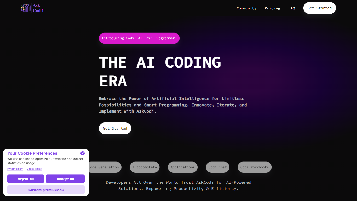 Step into the monochromatic yet vivid world of AskCodi, where sleek, modern design meets user-friendly digital interaction. Experience a space where powerful functionality and elegance coalesce, all wrapped in a high-contrast theme of pure whites and deep blacks. Powered by the robust and precise “Source Code Pro” typeface, AskCodi presents an immersive environment designed for both tech enthusiasts and casual browsers alike. The intuitive layout ensures effortless navigation, drawing visitors through each section with sticky menus that make key resources persistently accessible. Striking the right balance between aesthetic appeal and practicality, AskCodi offers a backdrop of subtle gradients that complement the bold central elements, making every click a stimulating visual journey.