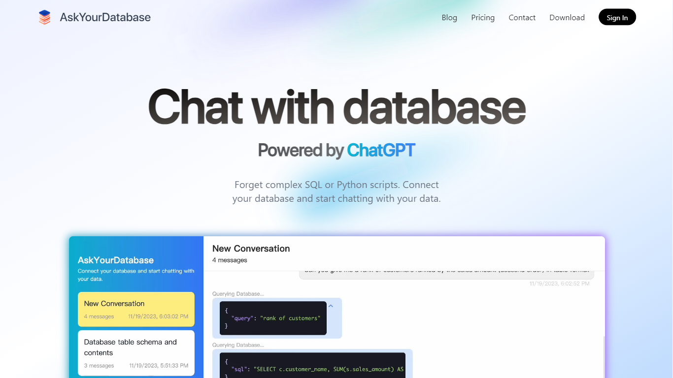 AskYourDatabase revolutionizes the way you interact with your databases by bringing the power of conversation to data management. This innovative plugin, designed specifically for ChatGPT, enables you to communicate with your database using simple natural language. Gone are the days of wrestling with complicated SQL queries or Python scripts. With AskYourDatabase, you can directly connect your SQL or NoSQL databases and start an intuitive chat to gain insights, visualize data, insert mockup information, design table schemas, and effortlessly handle numerous other tasks that traditionally require in-depth technical knowledge. Simplify business intelligence and make data-driven decisions faster by integrating the first AI native database client into your workflow. Whether you are a developer, manager, or CEO, AskYourDatabase’s ease of use, coupled with enterprise-grade security measures such as support for ChatGPT Enterprise and local connections, make it a trustable solution for over a hundred companies worldwide. Install it now and experience the future of database interaction.
