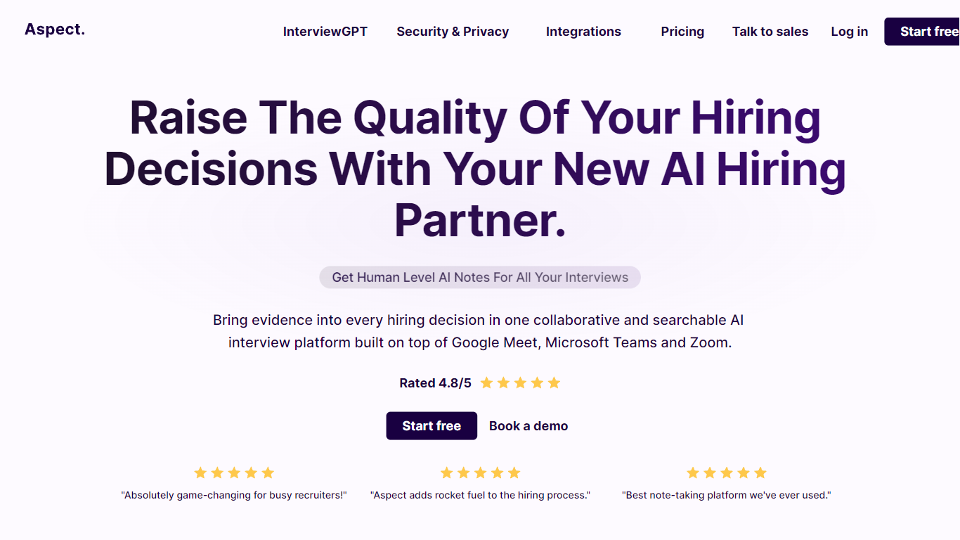 Aspect is revolutionizing the interview process with its cutting-edge AI copilot designed for talent teams and recruiters. This advanced platform seamlessly integrates with popular conferencing tools like Google Meet, Microsoft Teams, and Zoom, providing an efficient and collaborative environment for conducting interviews. Aspect’s AI-driven technology offers human-level interview notes, ensuring no valuable insights are missed, and allows users to make data-driven hiring decisions without the distractions of manual note-taking.