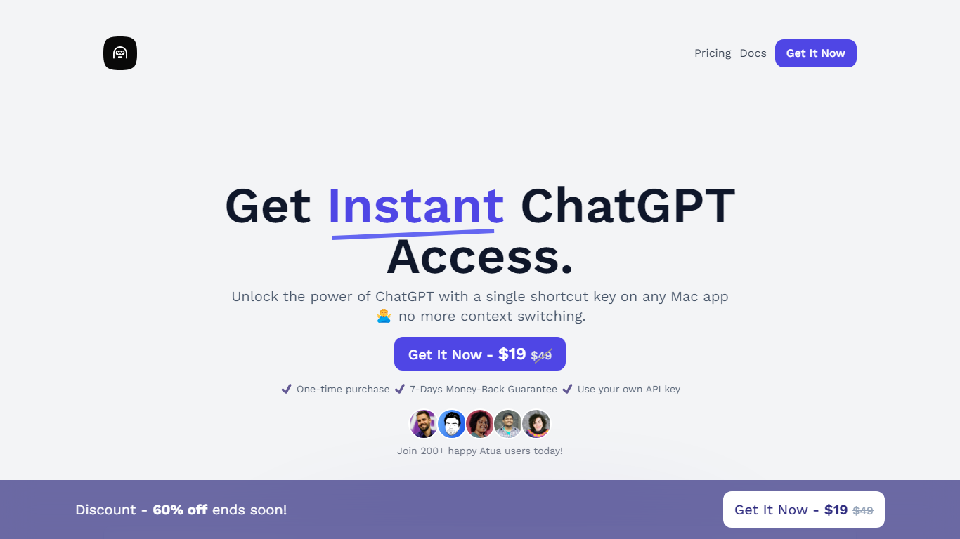 Transform your Mac into a powerful ChatGPT command center with Atua, your one-stop solution for seamless AI integration. **Atua unlocks the full potential of ChatGPT directly on your Mac** without the need to switch contexts. It enables you to **access ChatGPT through a simple shortcut key** from any Mac app, offering immediate, **hassle-free AI assistance**. Whether you’re looking to **customize commands, process text effortlessly**, or even **save conversation histories**—Atua has got it covered. With a **60% off introductory discount** and a **7-day money-back guarantee**, there’s no better time to join 200+ satisfied users. Experience how Atua can revolutionize your workflow!