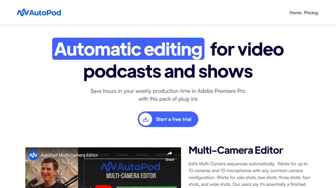 AutoPod revolutionizes video editing for podcasters and show creators using Adobe Premiere Pro. With a powerful suite of plug-ins, AutoPod simplifies the video editing process, saving you hours each week. Whether you are working with multi-camera sequences or crafting engaging social media clips, AutoPod’s automated features streamline the editing workflow, allowing for automatic edits, jump cuts during silent portions, and custom preset saving for consistent use. Experience a near-complete edit with automatically reconfigured sequences for up to 10 cameras and 10 microphones, catering to various shot types and camera configurations. AutoPod is built by editors for editors, focusing on automation of repetitive tasks and ensuring that your creative process is efficient and intuitive.