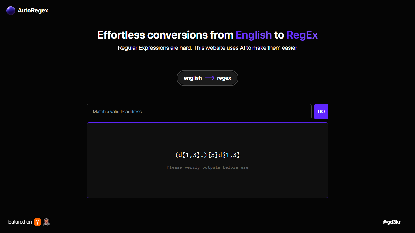 Users can input English text, such as specific patterns or requirements, and the website utilizes AI to generate the corresponding Regular Expression. As an example, the site provides a feature to match valid email addresses, demonstrating the transformation from plain English to the corresponding RegEx code. However, a cautionary note advises users to verify the generated outputs before implementation, emphasizing the importance of accuracy in utilizing Regular Expressions. Overall, the website serves as a valuable tool for individuals seeking to streamline the conversion process and enhance their efficiency in working with Regular Expressions.