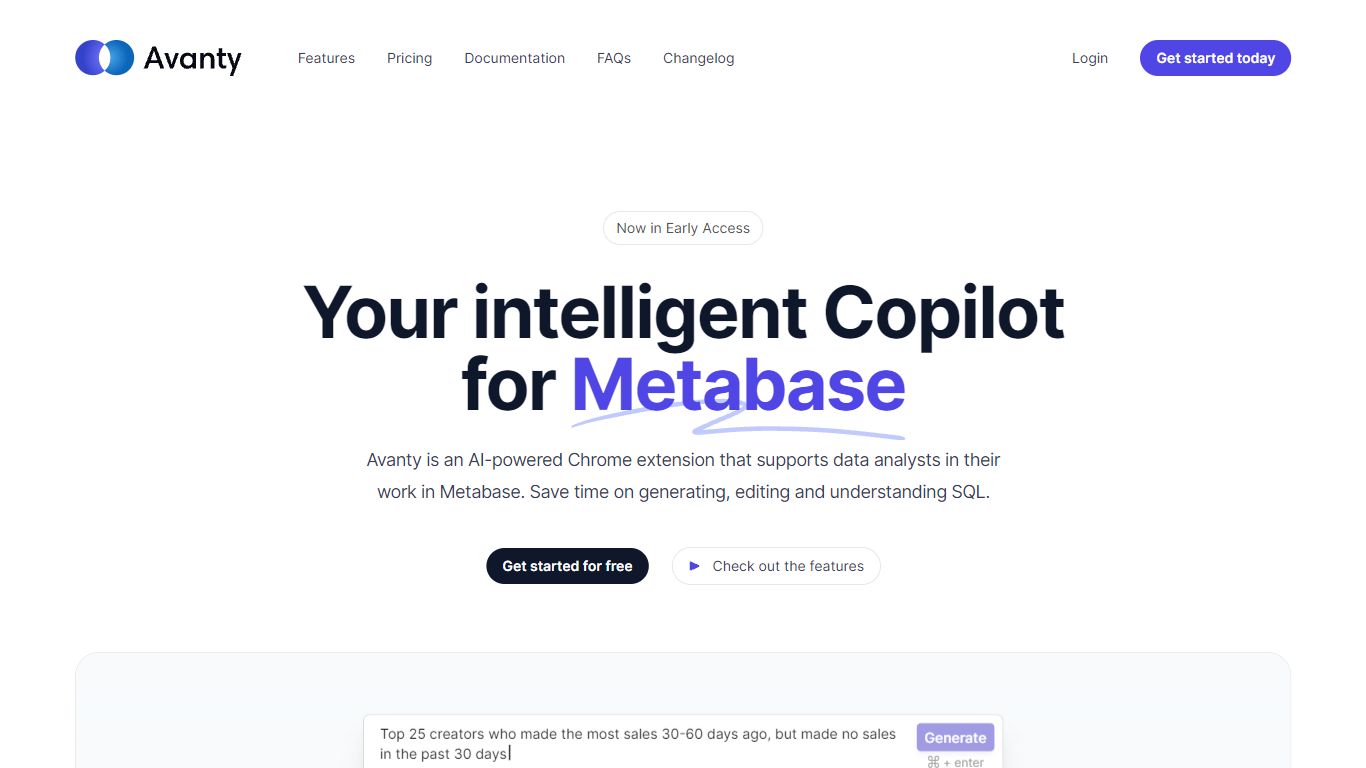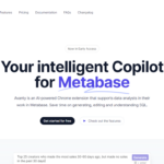Unlock the full potential of your Metabase data analytics with Avanty, the AI-powered Chrome extension specifically designed to streamline your SQL query process. Avanty offers a suite of advanced features including automatic SQL query generation from natural language, intelligent editing, and auto-generated chart titles, all aimed at saving you time and effort. With intuitive error debugging, you can say goodbye to the frustration of typos or missing brackets, and with the extension’s smart formatting, your queries will be clear and easy to read. Avanty is currently in early access and is the perfect tool for enhancing your workflow, whether you’re a data analyst or part of a larger team. Offering compatibility with both self-hosted and cloud-based Metabase instances, Avanty ensures secure handling of metadata without ever accessing sensitive customer data. Get started today with a free trial or take advantage of the early access pricing!