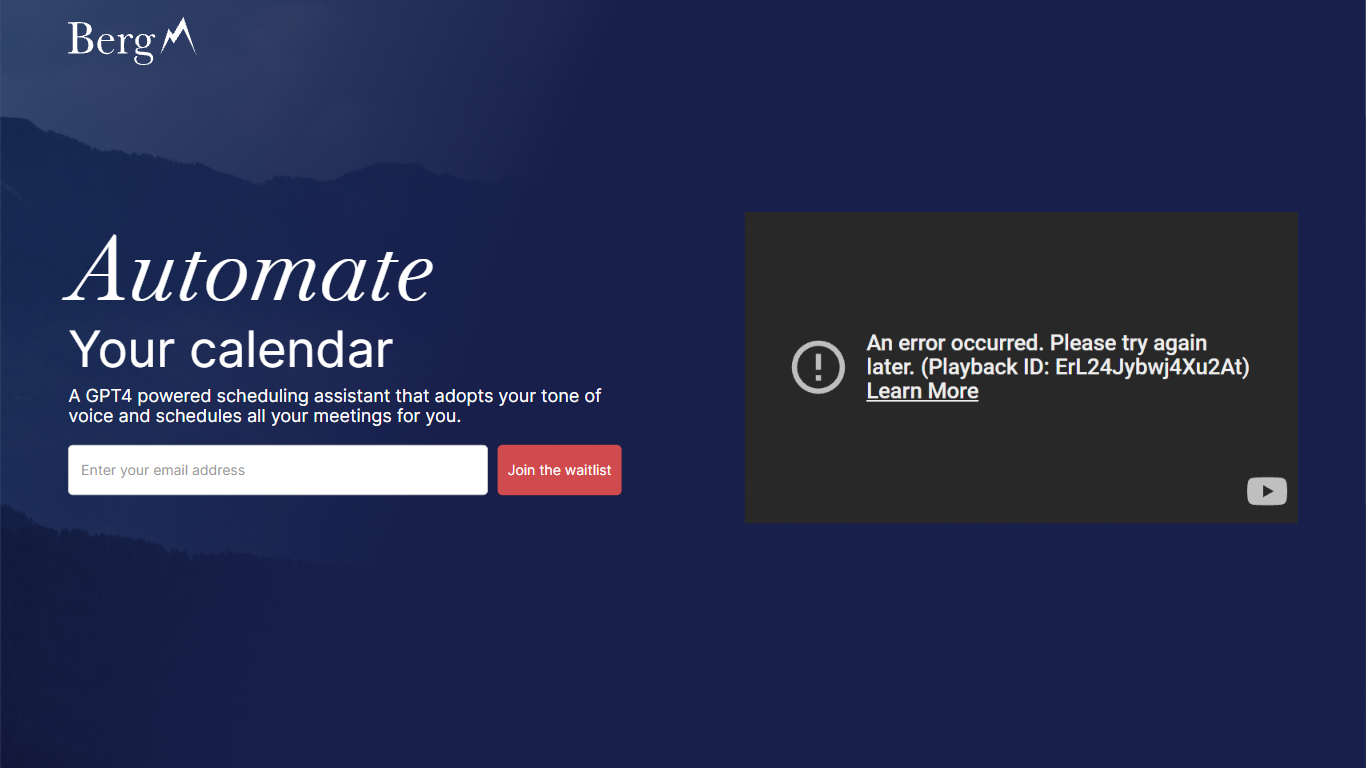 The Berg Scheduling Assistant is an innovative tool designed to revolutionize the way professionals manage their calendars. By harnessing the advanced capabilities of GPT-4, this scheduling assistant is not just another calendar tool; it’s an AI-powered personal assistant that ensures your meetings are arranged without any hassle. With the ability to adopt your unique tone of voice, this assistant provides a seamless integration into your workday, scheduling meetings as though you were doing it yourself—maintaining your personal touch and professionalism. Gone are the days of double bookings and missed appointments; the Berg Scheduling Assistant intelligently organizes your schedule so you can focus on what truly matters in your business. In the rare event of a technical hiccup, prompt assistance is provided to ensure that your experience remains smooth and uninterrupted.