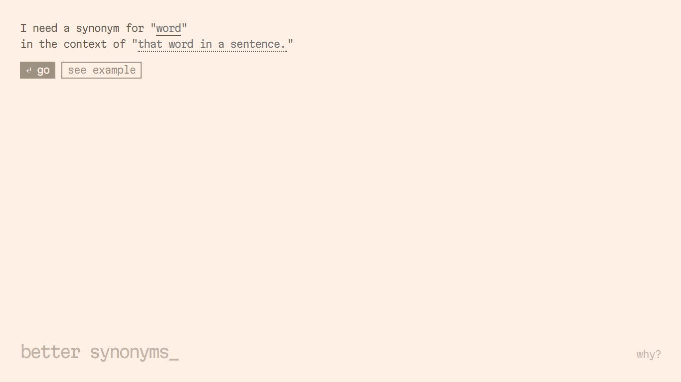 Online thesauruses won’t cut it, they simply lack the context. Tell us how you plan to use the word or phrase and we’ll find the perfect match every time with the help of the world’s most powerful AI.