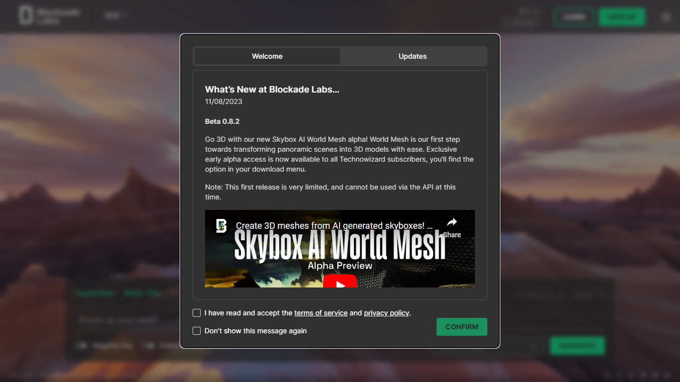 Stay connected and share your creations with a global audience. Sign up to join our vibrant community and gain access to the latest beta version 0.8.2. With Blockade Labs, your 3D worlds are just a click away, ready to be downloaded, remixed, and shared across your network. All rights reserved © 2023 Blockade Labs.