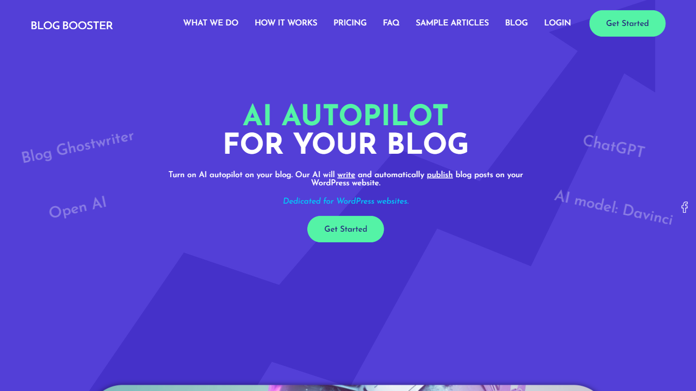 BLOGBOOSTER.ai is an AI-powered platform that offers an autopilot feature for your blog. With our advanced AI models, we generate a list of subjects dedicated to your blog and automatically write and publish high-quality blog posts on your WordPress website. This not only saves you time and effort but also helps boost your website’s SEO and drive more organic traffic, leading to increased sales and conversions. Our cyclical content updating strategy ensures that your website remains fresh and relevant, contributing to improved search engine rankings.