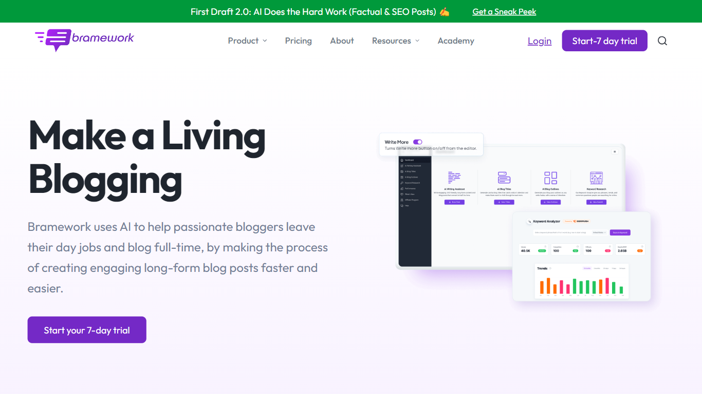 Bramework is an AI-powered writing tool designed to supercharge your blog and turn your passion for blogging into a full-time career. With Bramework, you can create high-quality, SEO-optimized blog posts in no time.