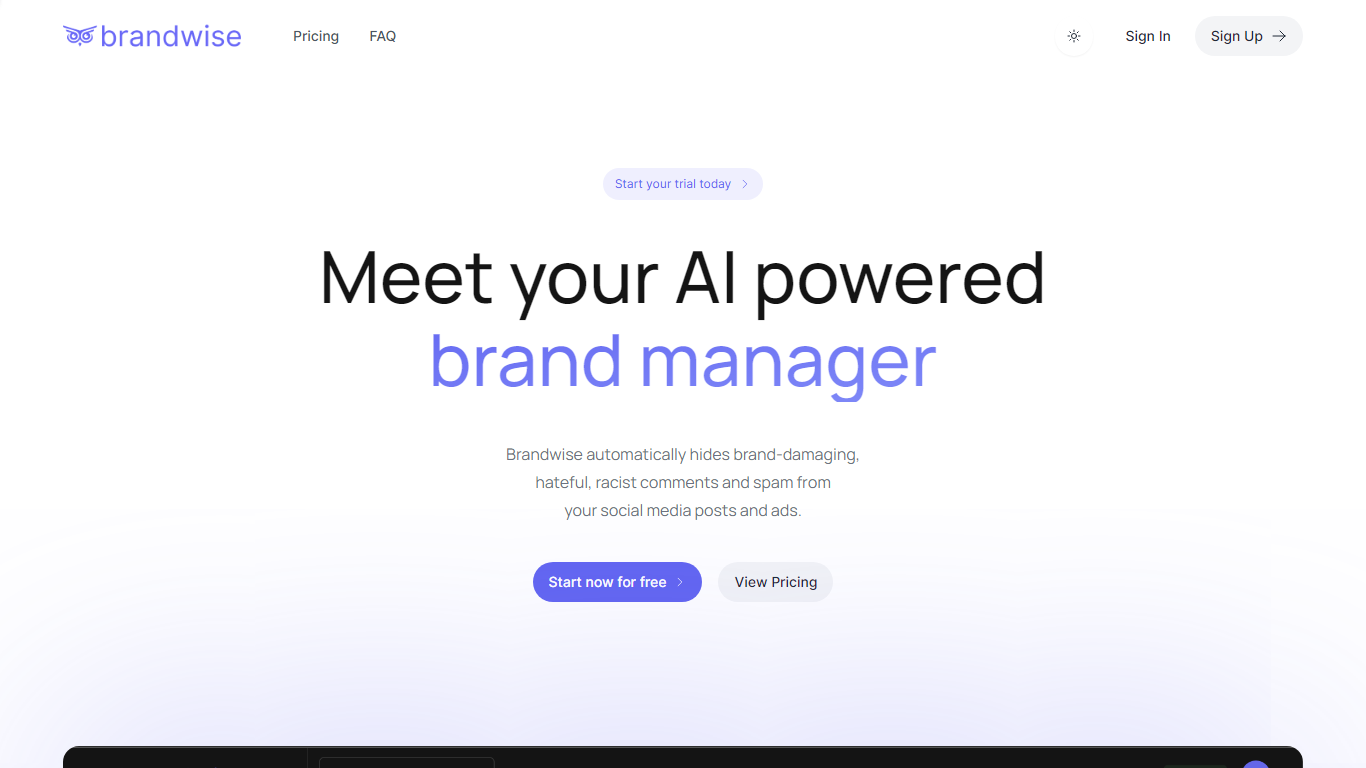 Introducing Brandwise, the trailblazing AI-powered brand manager that shields your social media presence from undesirable elements. Enjoy the tranquility of 24/7 automated moderation across both paid and organic content, as this sophisticated system discreetly removes brand-damaging comments, hateful speech, and spam before they tarnish your reputation. With sentiment analysis at its core, Brandwise ensures only the best interactions remain visible while offering a discreet way to handle negative feedback, making them visible only to the commenter. Tailor your moderation with custom keyword filters and manage responses efficiently through an intuitive dashboard. Brandwise’s multi-lingual capabilities extend its protective cover to a broader audience, recognizing and moderating comments in 95 languages. Empower your team with unlimited user accounts, ensuring seamless collaboration and brand protection. Delve into the world of Brandwise with flexible pricing plans, starting with a complimentary 7-day trial.