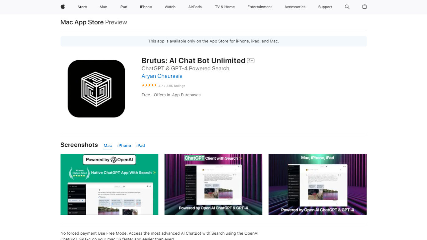Discover the boundless capabilities of conversational AI with Brutus: AI Chat Bot Unlimited, now available on the App Store. This innovative chatbot assistant, powered by OpenAI’s GPT-4, brings an intelligent and engaging conversational experience right to your macOS, iPhone, or iPad. With its roots in the cutting-edge ChatGPT API, Brutus is not just powerful but also an independent product, assuring users of its non-affiliation with OpenAI. Featuring a SEARCH function that leverages the prowess of GPT-4, the chatbot transcends mere conversation. It stands ready to assist with educational queries, language learning, or even sparking creativity with its content generation skills. With multi-language support and a commitment to user privacy, the assistant operates within a safe, secure conversational space. Emphasizing user-friendliness, its seamless interface provides smooth, enjoyable interactions. Furthermore, with recent updates ensuring a bug-free experience and localized in various languages, Brutus is shaping up to be the personal AI assistant of choice for users worldwide— all without forcing payment, as Free Mode provides ample access to these vast capabilities.