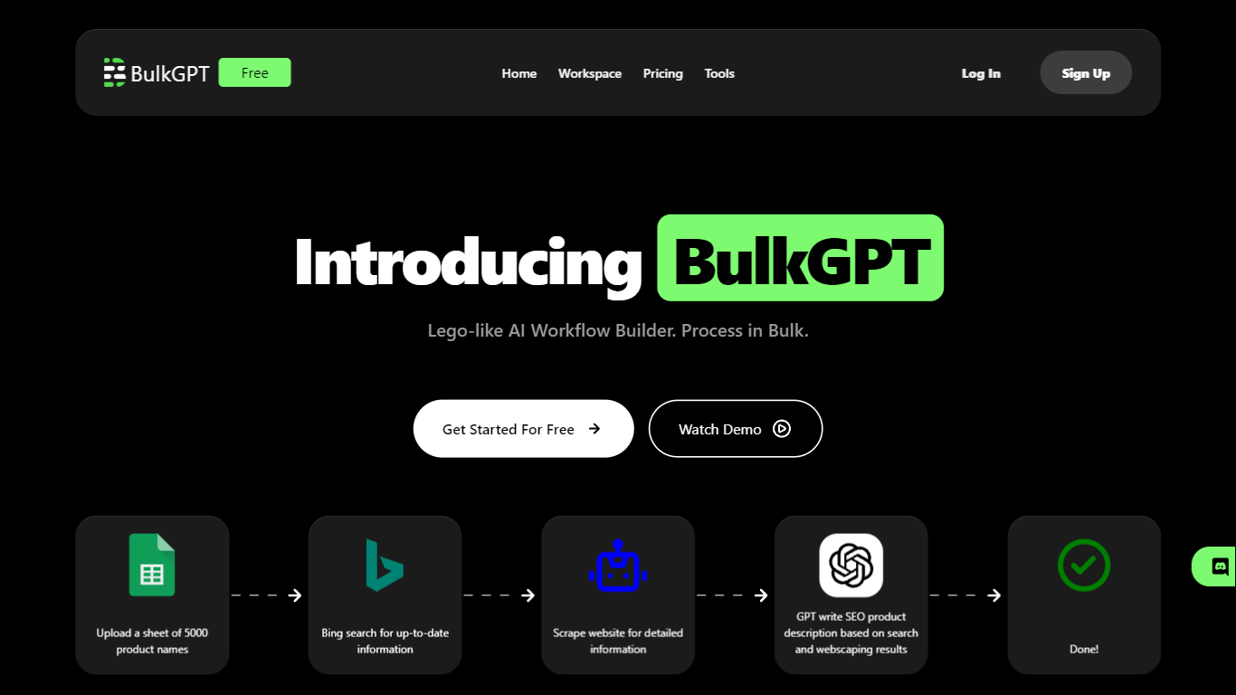 BulkGPT revolutionizes the way AI-driven content creation operates by offering a powerful batch processing service for ChatGPT requests, which is ideal for large-scale projects. It enables the seamless creation of multiple items concurrently, significantly reducing the time and effort typically associated with such tasks. Whether you’re looking to generate SEO-optimized content, detailed product descriptions, or even analyze large sets of data, BulkGPT’s AI Workflow Builder allows for a flexible and efficient way to handle up to 5000 tasks in one go. The system boasts super-fast parallel processing and supports both CSV and JSON formats for easy data import and export. It’s designed to cater to a variety of industries from e-commerce to research, making it a versatile tool for businesses aiming to enhance their productivity and content quality.