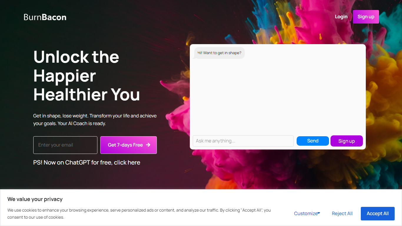Transform your health and fitness journey with BurnBacon, where personalized support meets innovative AI technology. Our comprehensive platform offers tailored meal plans crafted to align with your nutritional needs and fitness aspirations. Experience the thrill of engaging workouts that adapt to your evolving fitness levels. To bolster your commitment, our unwavering motivational support is with you every step of the way. Embark on this transformative path towards your best self with a free trial and feel the difference that a custom-tailored health regimen can make in your life.