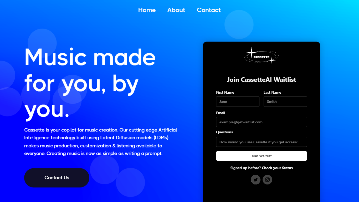 Cassette is your copilot for music creation. Our cutting edge Artificial Intelligence technology built using Latent Diffusion models (LDMs) makes music production, customization & listening available to everyone. Creating music is now as simple as writing a prompt.