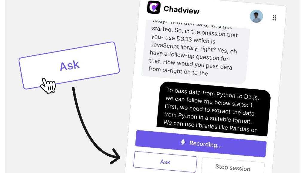 - Receive instant answers in real-time: During the video call, simply press the “Ask” button, and our extension will deliver answers to any questions asked. The extension continuously records the conversation. When you press the “Ask” button, it reviews the previous 30 seconds, identifies the question, and generates a suitable response for you in 3-4 seconds.