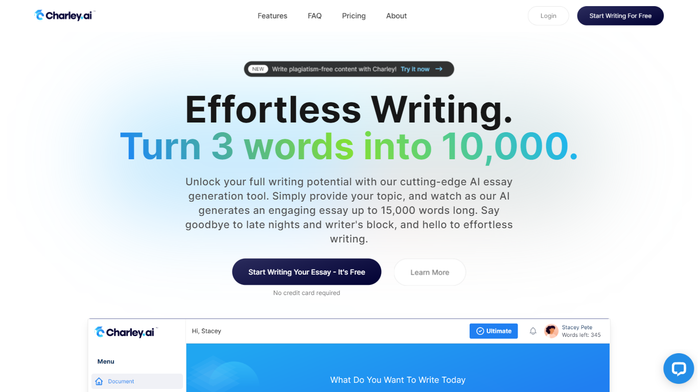Unlock the potential of effortless essay writing with Charley.ai, the leading AI-powered essay generation tool that is revolutionizing the way students and professionals craft their written work. With Charley.ai, transform three simple words into an engaging, plagiarism-free essay of up to 15,000 words in mere seconds. Our platform serves over 250,000 users who have collectively written more than 20 million words, demonstrating the trust and efficiency of Charley’s AI technology.