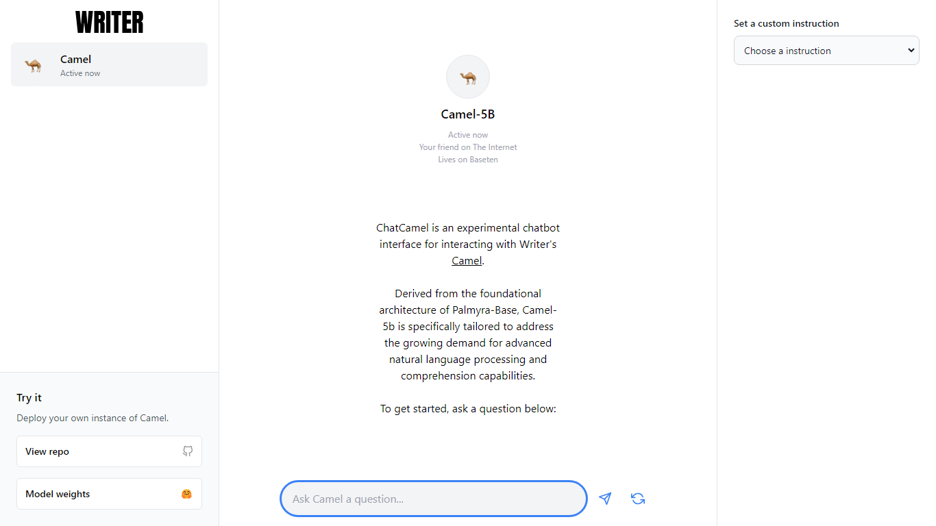 Equipped with Baseten, ChatCamel brings to you the chance to interact with Writer’s Camel through an experimental interface. This friendly AI companion is not just a technical marvel; it’s a versatile entity ready to engage you on the Internet. From answering your burning questions to tailoring conversations to your interests, ChatCamel awaits to astonish with its capabilities.