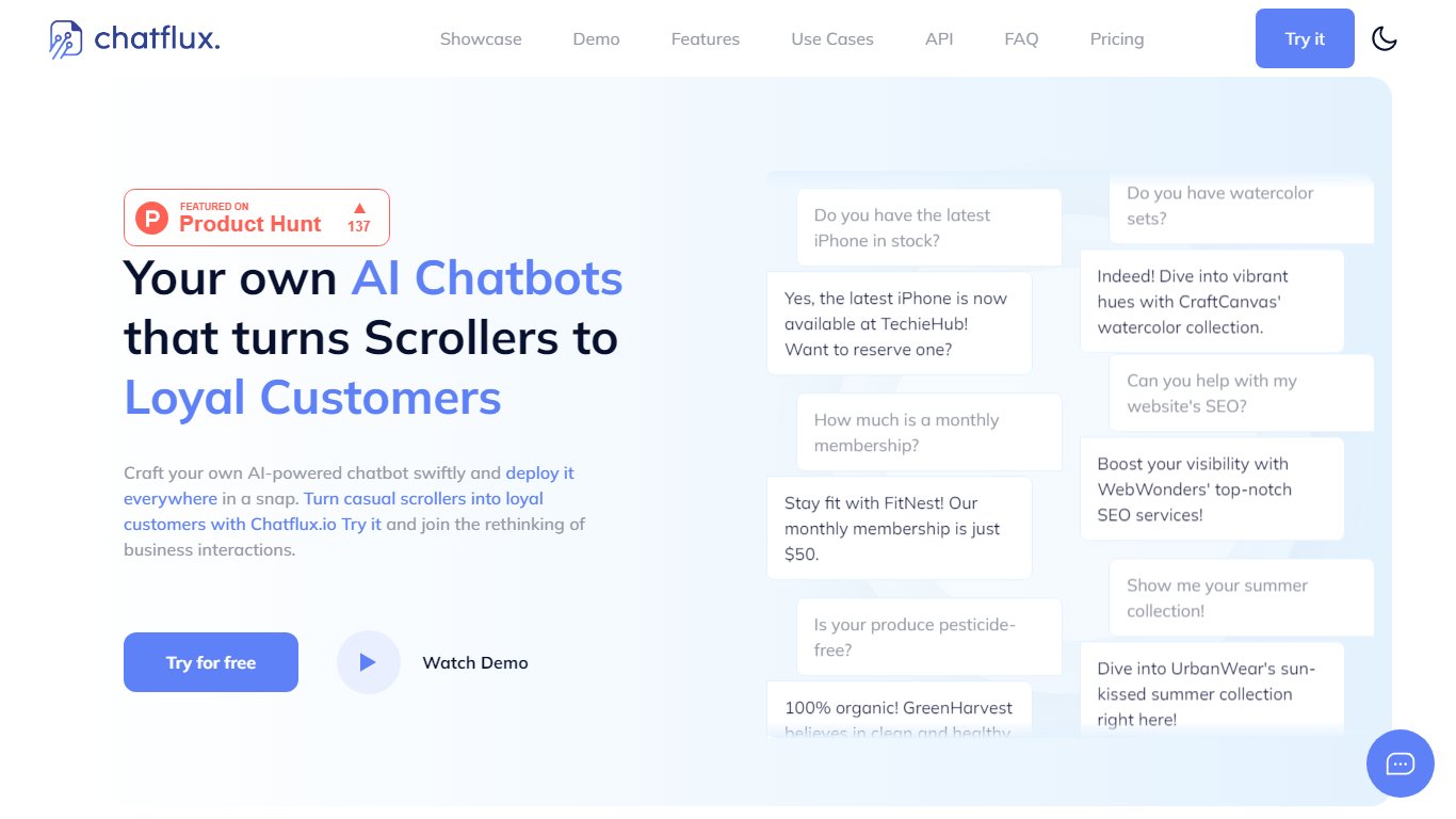 Transform your online visitor experience with Chatflux.io, the cutting-edge AI chatbot platform designed to convert casual scrollers into loyal customers. Utilize the power of artificial intelligence to craft and deploy personalized chatbots rapidly across various touchpoints. With Chatflux.io, you’re not only facilitating smooth interactions but also redefining the way businesses engage with their audience. Experience it firsthand with a free trial and unlock the potential to revolutionize customer service, sales, and marketing. Watch our demo and let Chatflux.io guide you towards crafting superior customer journeys.