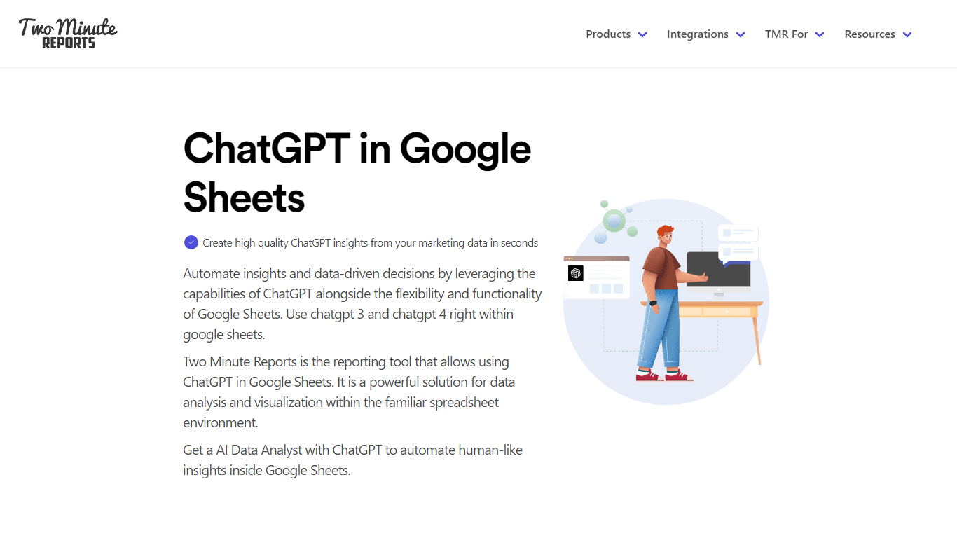 Two Minute Reports brings ChatGPT’s advanced AI capabilities into the realm of Google Sheets to enhance data analysis and reporting efficiency. Uncover potent insights and expedite data-driven decision-making by harnessing the combined power of ChatGPT versions 3 and 4 within a Google Sheets environment. With an array of integrations such as Facebook Ads, Google Analytics 4, and Google Ads, crafting custom dashboards and actionable performance insights has never been easier. Boasting over 75 integrations, including SEO, PPC, and Social Media, Two Minute Reports caters to a diverse range of marketing and analytics needs. Dive into our comprehensive templates and knowledge base to seamlessly start creating reports and dashboards that matter.