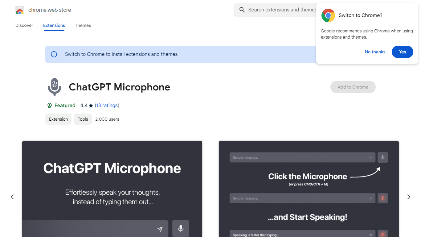 Enhance your ChatGPT experience with the revolutionary ChatGPT Microphone extension, available now on the Chrome Web Store. This cutting-edge tool equips ChatGPT users with the convenience of voice-to-text functionality, streamlining the way you communicate with the AI. Say goodbye to manual typing and hello to efficient, voice-driven conversations.