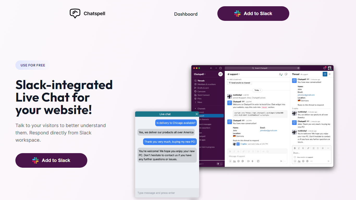 Enhance your website’s customer engagement with Chatspell, the innovative Slack-integrated Live Chat solution. Offering a seamless experience for your visitors, Chatspell allows you to interact directly from your Slack workspace, opening up a direct line of communication that’s both efficient and user-friendly.
