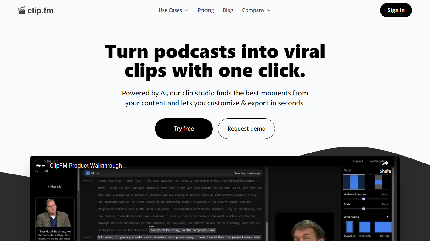 ClipFM revolutionizes the way podcasters and content creators repurpose video content. With its AI-powered clip studio, users can transform lengthy videos into engaging, short clips perfect for social media. Effortlessly locating the prime segments in your videos, you can customize and share these viral-ready moments within minutes. Tailored specifically for professionals such as podcasters, editors, marketers, agencies, and studios, ClipFM offers a cost-effective alternative to hiring costly editors, thus saving money and precious time.