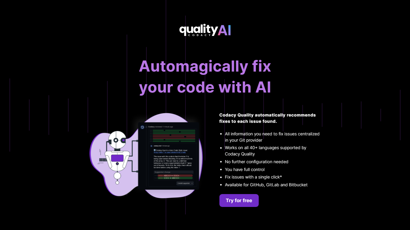 Codacy Quality provides an innovative solution to enhance your coding experience. With this powerful tool, you can **automatically identify and fix issues** in your codebase across 40+ languages with no extra configuration. Direct integration with your Git provider ensures all necessary information for correcting code problems is easily accessible. Codacy Quality’s seamless operation allows for a single-click fix within the familiar environment of GitHub, GitLab, or Bitbucket. Experience the future of code maintenance with Codacy Quality and **take complete control over resolving coding issues**. Benefit from the simplicity and efficiency of automating code fixes and share your AI-powered coding journey today. See Codacy Quality in action and start improving your code with minimal effort.