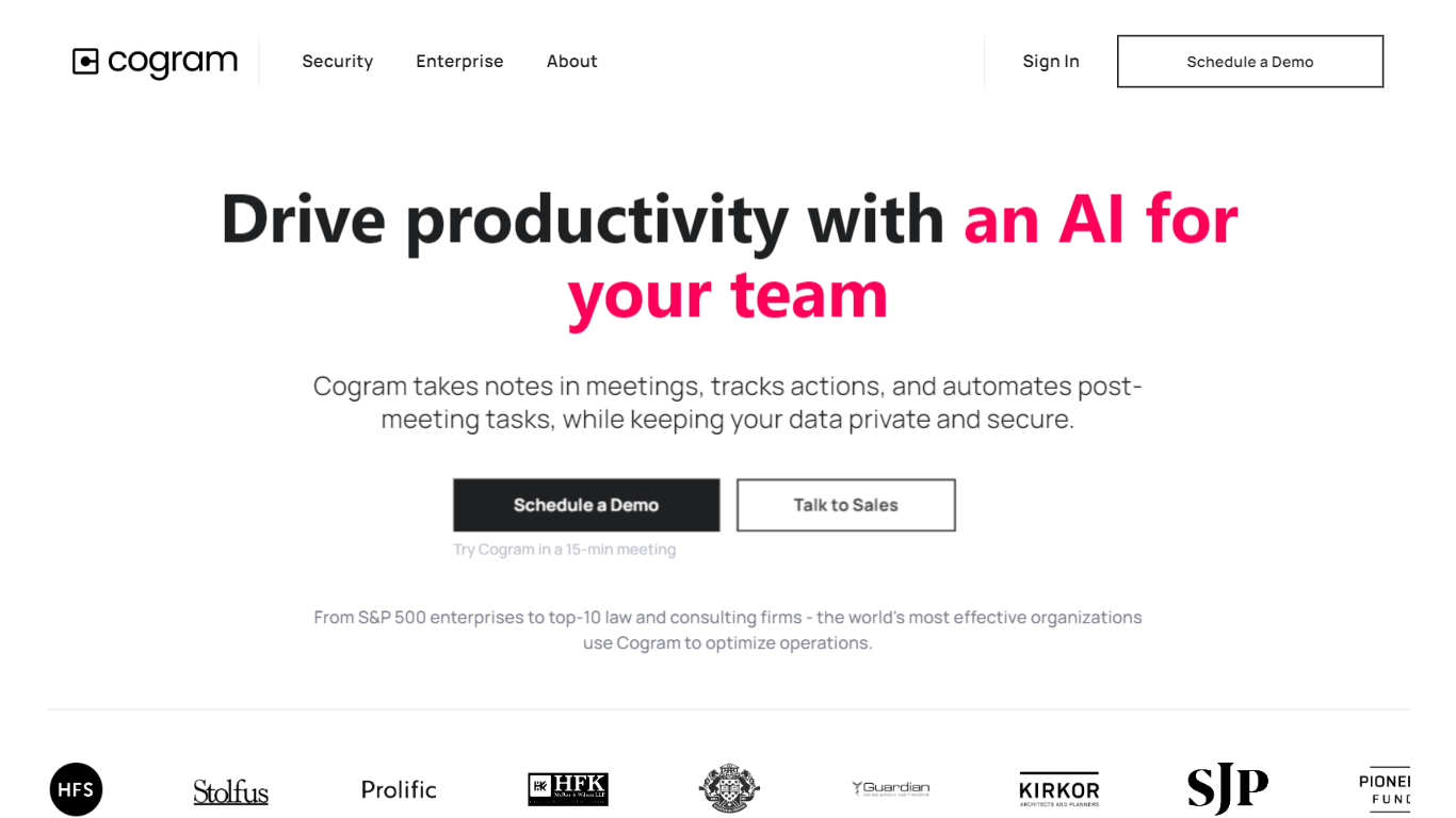 Boost your team’s productivity with Cogram, an AI coworker that streamlines your business operations. Cogram is designed to enhance sales and business development, improve client meetings, ensure customer success, optimize project management, and facilitate internal meetings. With Cogram, you can easily take notes in meetings, track action items, and automate post-meeting tasks, all while keeping your data private and secure. Trusted by S&P 500 enterprises and top-10 law and consulting firms, Cogram is the tool of choice for organizations looking to maximize efficiency and drive success.