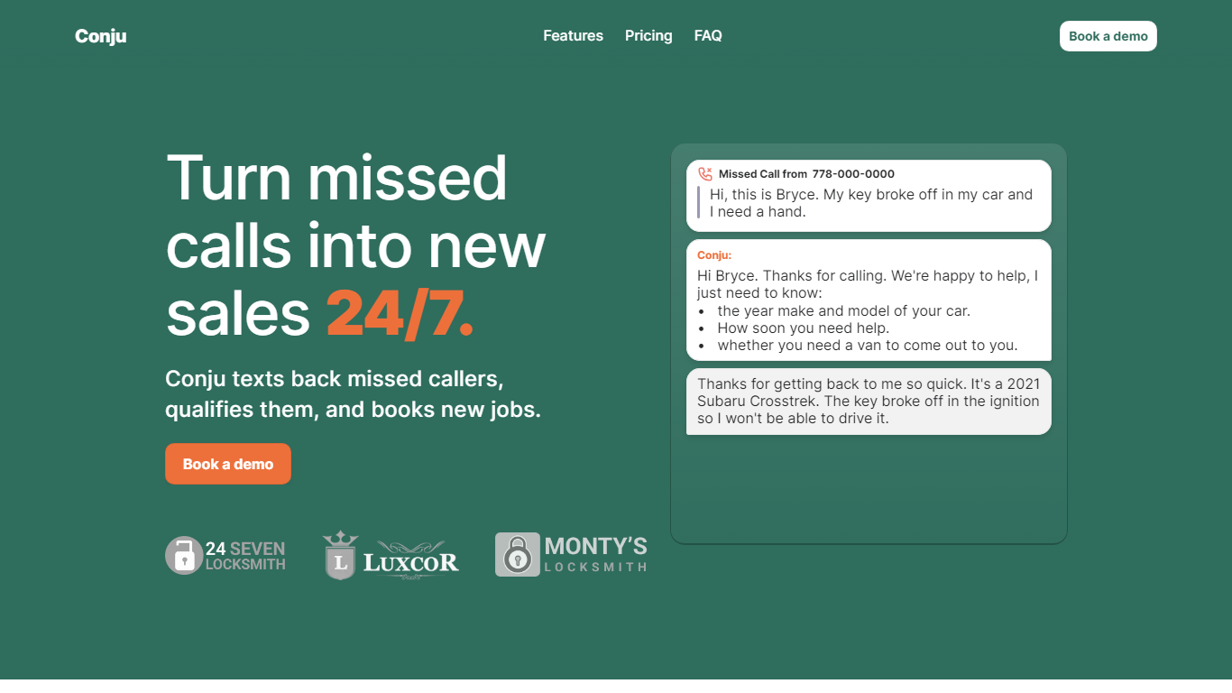 Transform missed opportunities into confirmed sales with Conju’s innovative AI system that operates around the clock to engage, qualify, and follow up with your missed callers. Conju provides an automated texting service that immediately responds to missed calls, delivering personalized SMS messages and swiftly moving leads through the qualification process to secure new jobs. This virtual crew member never sleeps, ensuring that your potential customers receive immediate attention even when you or your staff can’t answer the phone.
