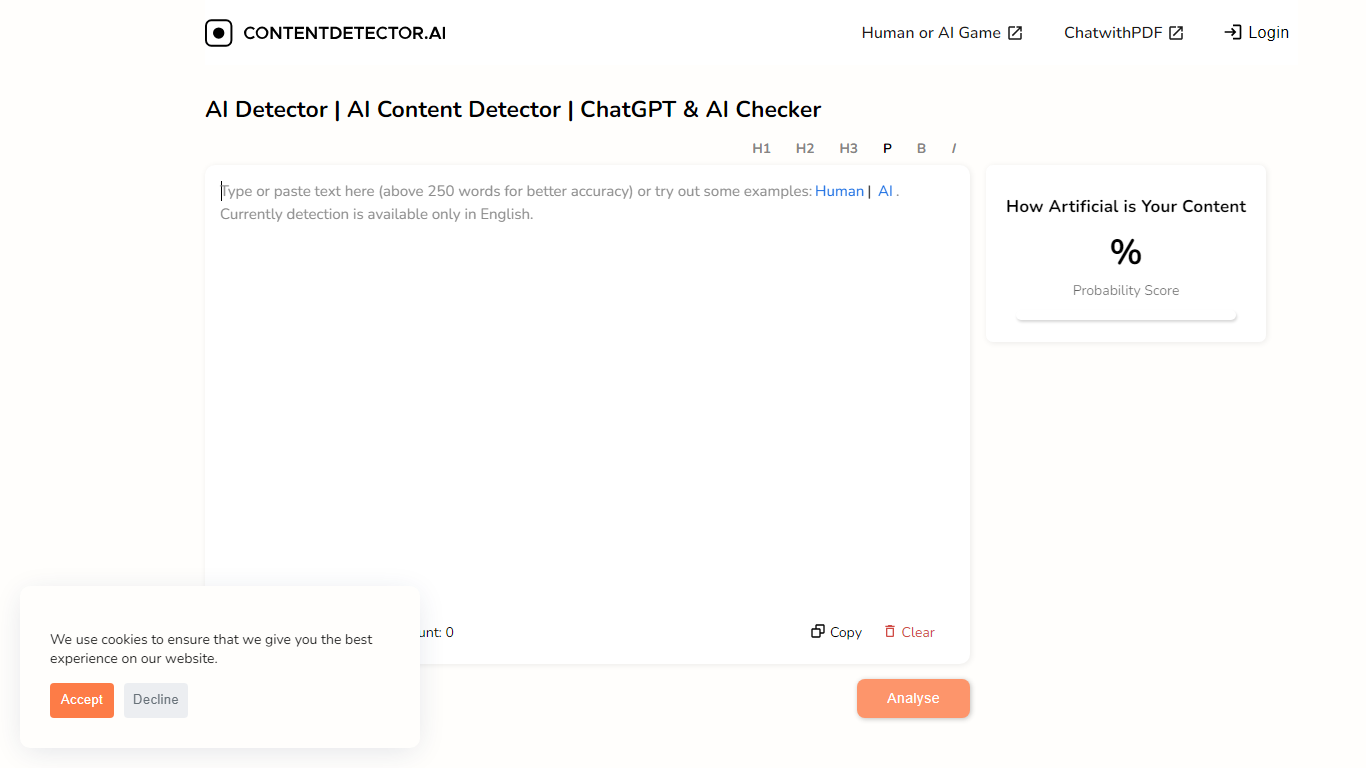 ContentDetector.AI also understands the value of functionality. This is why it’s not just an AI Checker and AI Plagiarism Checker, but also integrates a word counter and character counter for your convenience. The platform is incredibly user-friendly; all you need to do is copy and paste your text into our analysis field for a detailed, real-time analysis. Experience the reassurance of Quality Guaranteed with ContentDetector.AI, your partner in ensuring content integrity.