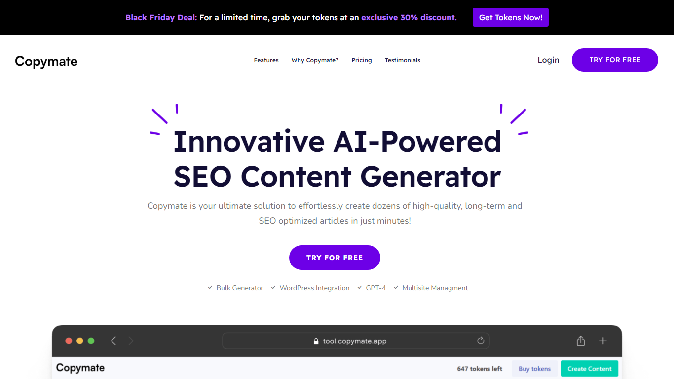 Embark on your content creation journey with Copymate, the innovative AI-powered solution designed to craft high-quality, SEO-optimized articles with remarkable ease and speed. Discover the power of producing numerous articles effortlessly and with long-term value. With just a few clicks, tap into the essence of SEO optimization and bolster your website’s visibility in search engine results. Experience instant content generation without compromising quality—perfect for those looking to save time and boost their online presence. Whether you’re a digital marketer, content creator, or SEO specialist, Copymate provides an efficient path to achieving your content goals. Enhance your productivity with features like Bulk Generator, WordPress Integration, and GPT-4, while managing content across multiple sites. Take advantage of our exclusive Black Friday Deal for an affordable pathway to limitless content.