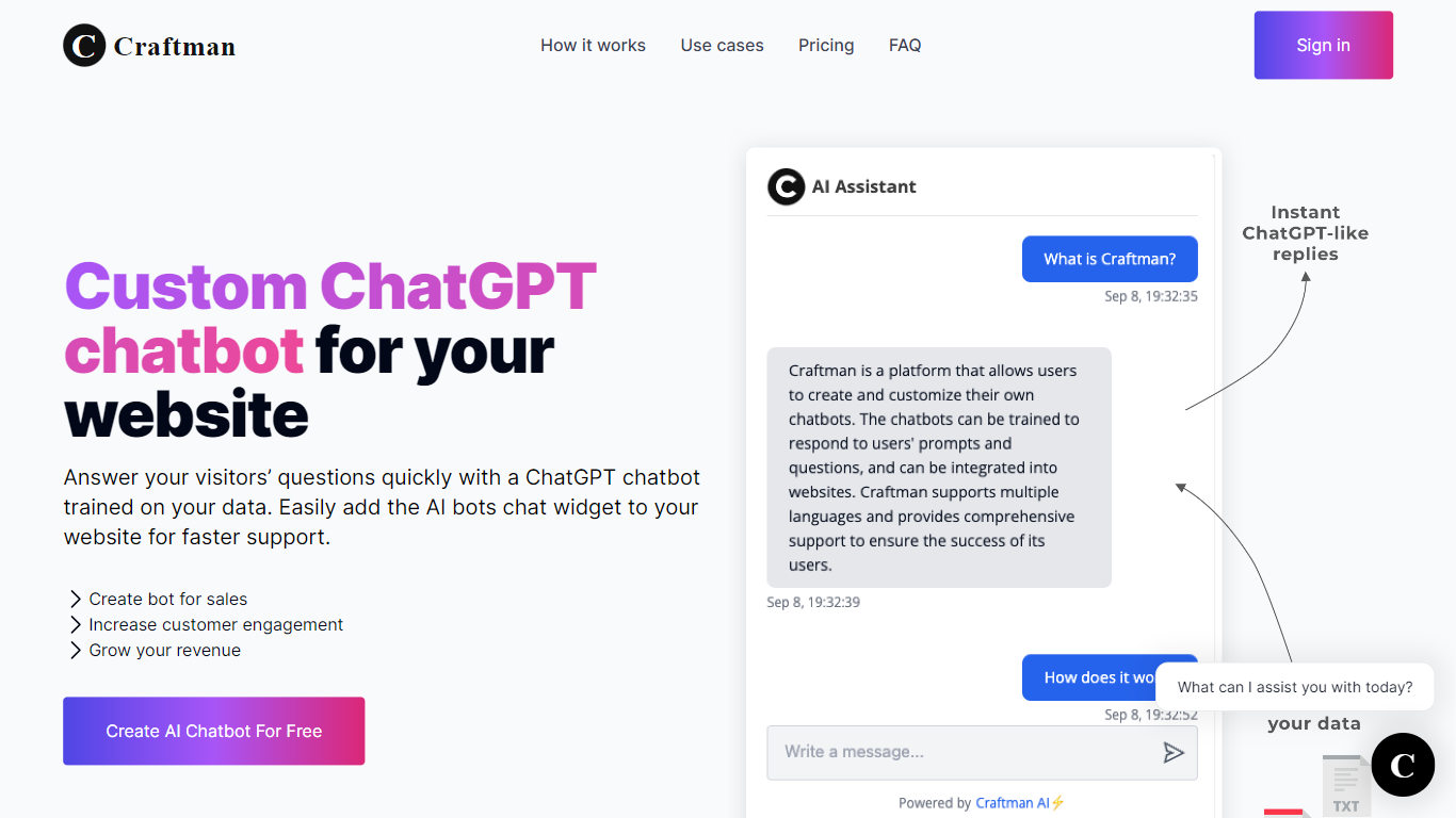 Craftman is a platform to create AI Growth chatbots that convert visitors into customers. Advanced AI chatbots trained on your data. These chatbots are designed to make more people buy from you and help your business grow.