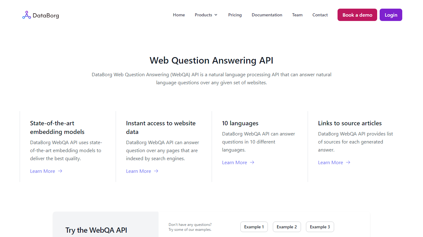 DataBorg’s WebQA API is built on state-of-the-art embedding models, ensuring the highest quality of response. This AI tool is not only multilingual, supporting 10 different languages, but it also provides instant access to website data indexed by search engines and links to source articles for greater transparency.