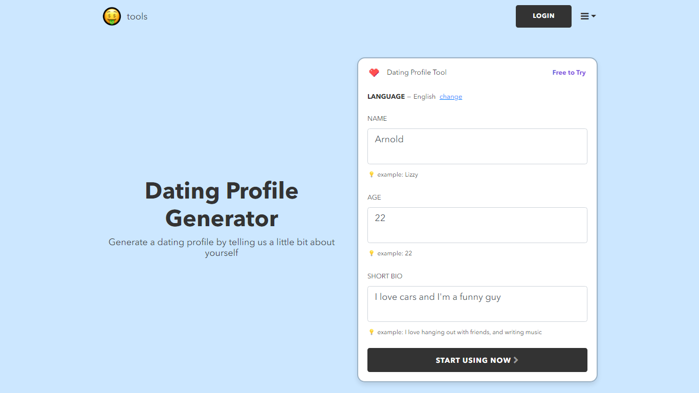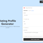 Create the perfect dating profile with ease using the nichesss Dating Profile Generator. Our tool is designed to simplify the process, quickly providing you with a crafted bio tailored for dating sites and apps like Tinder. Simply input your name, age, and a short bio – our intelligent AI does the rest, generating three unique profiles to choose from. It’s a fun and hassle-free way to present your best self online. Plus, with the first 30 generations free, there’s no reason not to give it a try. Whether you’re looking to save time or struggling to describe yourself, let our Dating Profile Generator craft your story. Start today and get ready to be amazed by the results!